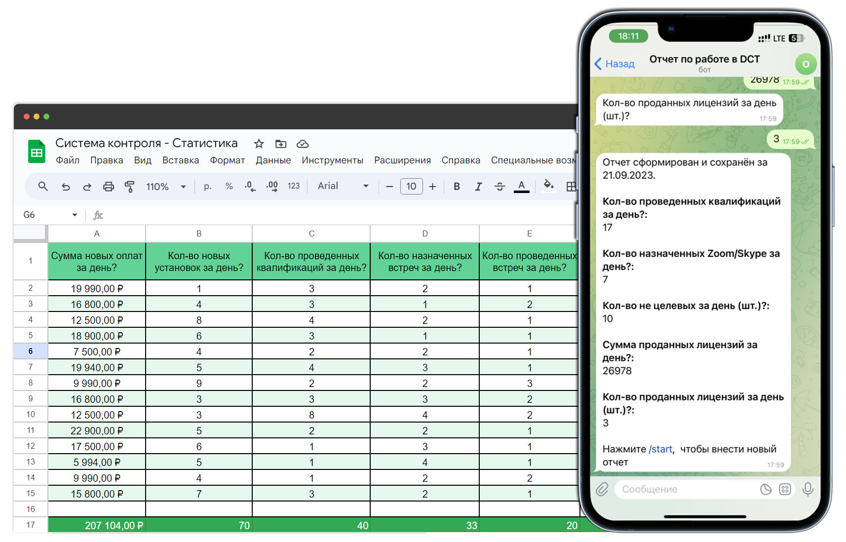 Созданы удобные отчеты которые заполняют сотрудники по своим должностным обязанностям, через моб. телефон или desktop приложение Telegram